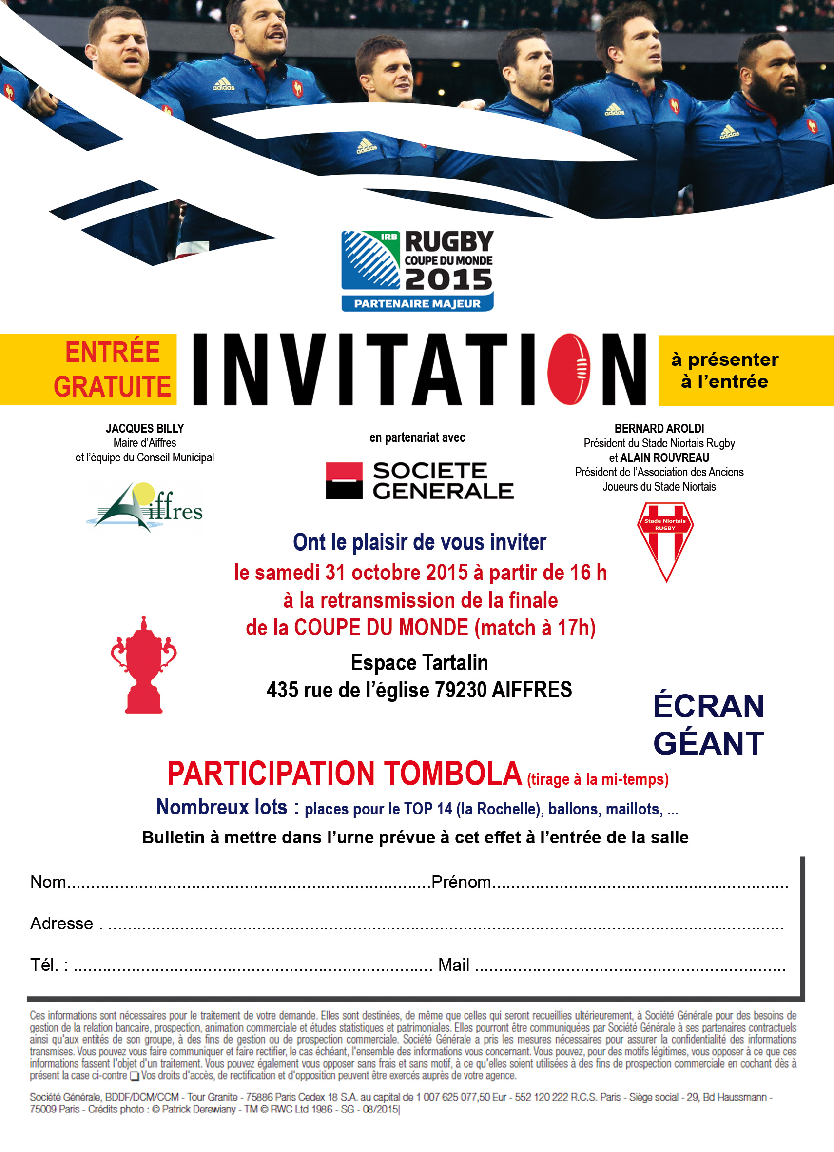 Chaque participant devra se munir de l'invitation que vous trouverez en pièce-jointe. Cette invitation peut également être retirée au secrétariat du Stade Niortais, à la mairie d'Aiffres ou dans les bureaux de la Société Générale à Niort.